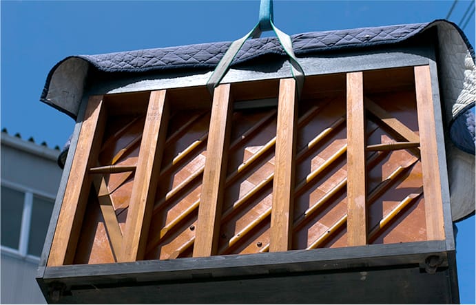 吊り下げ搬出で解決!ベッド、ソファー、タンス、本棚、ピアノなど、2階などに吊り上げて搬入したものや、解体して運び出せないものは、窓やベランダから吊り下げて搬出します。大型で重量のある家財を無理に運び出そうとすると天井や壁、床などを傷つけることがありますが、当社では作業に慣れたスタッフが慎重に搬出するのでご安心ください。
