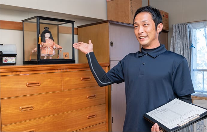 お客さまのご希望の日時に訪問して迅速に作業を進めます。買取可能な不用品はその場で価値を査定して、できる限り高価買取いたします。