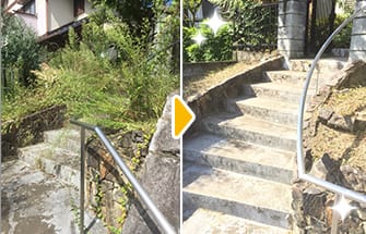 剪定&草取りで好印象家の印象を決めるお庭やエントランスも、清掃のプロが見違えるほどキレイにします。庭木の剪定から雑草除去、伐採・刈り取った草木の処分まで丸ごとお任せください。お庭のお手入れは防犯対策の基本でもあります。家周りが乱雑だと空き巣などの被害に遭いやすくなるので、こまめにお手入れすることをおすすめします。