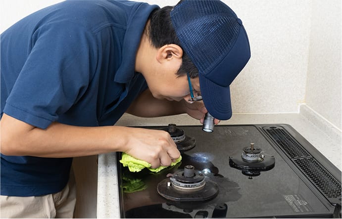 蛇口やシンクの水垢、排水溝のぬめり、コンロや換気扇の油汚れ、壁や床、吊り戸棚のベタつき汚れなどを確実に洗浄・除去します。