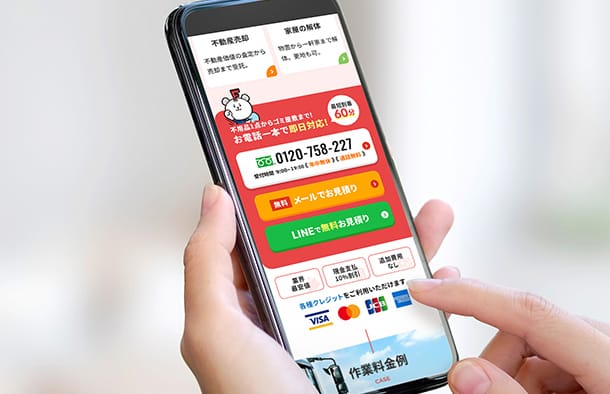 年中無休で受付不用品を自治体の粗大ゴミに出す場合は、収集日当日の朝に指定場所に出すのがルールです。従って、当日の朝一番にお伺いして搬出作業を進めることになるため、基本的には前日までのご依頼分に対応しております。ご依頼は電話・メール・LINEから年中無休で承っています。粗大ゴミに粗大ごみシールを貼り付けてお待ちください。