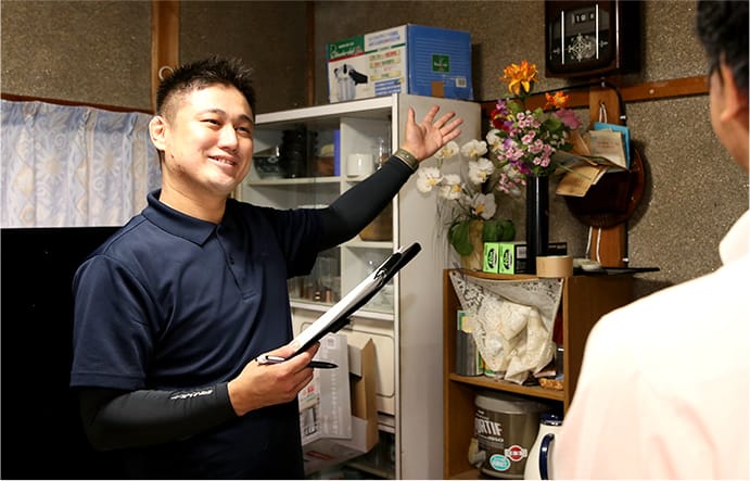 電話、メール、LINEからのお問い合わせを年中無休で受け付けております。早急な対応をご希望の場合は、お電話1本いただければ即日最短60分で訪問いたします。いつでもお気軽にご依頼ください。