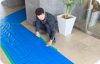 建物の内外をしっかり養生し、大型家具などはきちんと梱包したうえで搬出作業を進めます。建物も大切な家財も傷つけません。